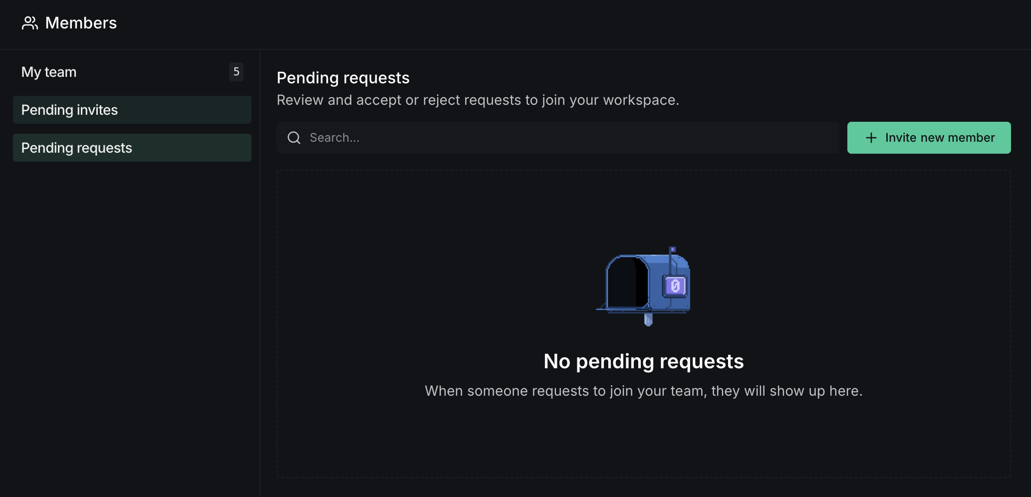 The Members page lets you manage who has access to your workspace. You can view current team members, invite new ones, manage pending invitations, and review pending requests.