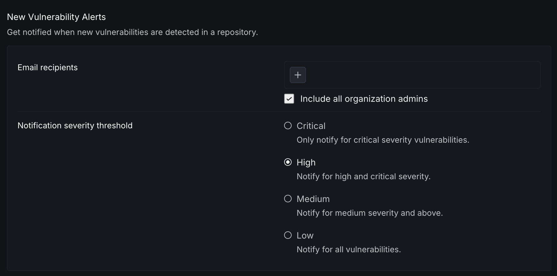 - Email recipients: Add individual email addresses to receive vulnerability alerts